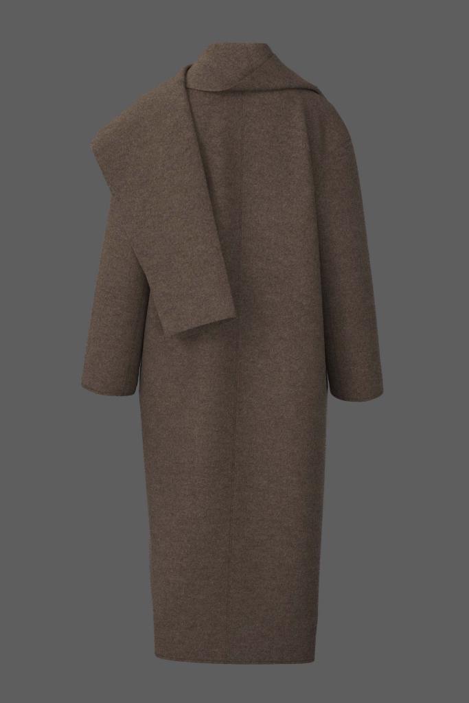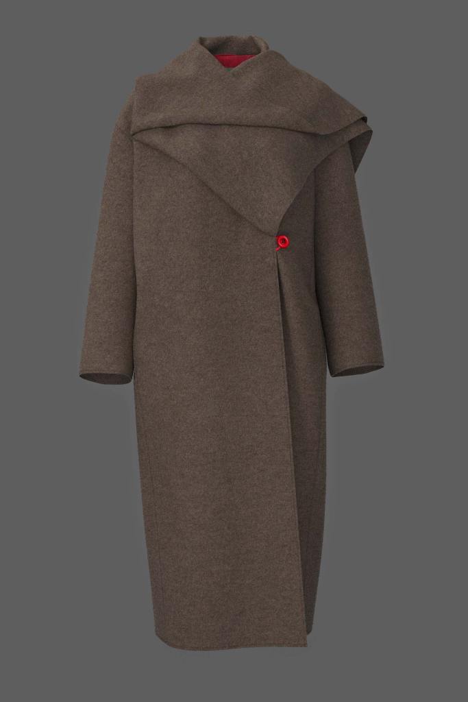 Cappotto in lana cotta con tagli a vivo, dalla plastica morbida e volume avvolgente. Silhouette ampia con linea spalla fluida, manica diritta leggermente accorciata. L’abbottonatura asimmetrica crea un collo che si prolunga in sciarpa. Chiusura minimale con un solo bottone. Lunghezza: 123 cm. Prototipo unico.