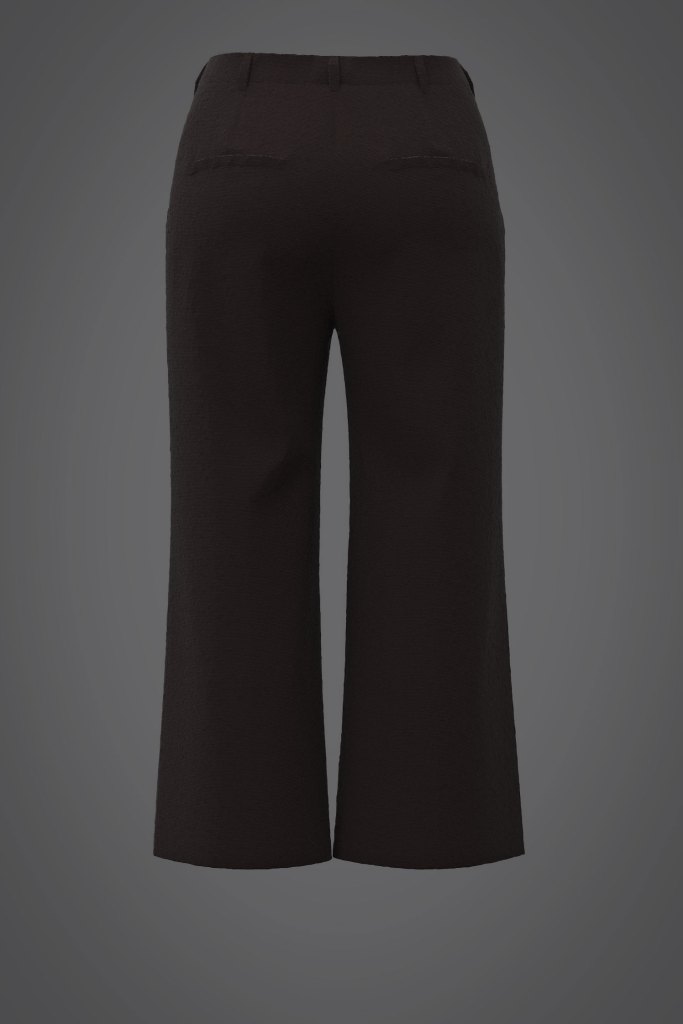 Realizzato in lana. Linea dritta, moderatamente ampia. Tasche oblique sul davanti e due tasche a filetto sul retro. Cintura sagomata che segue la linea del corpo. Chiusura frontale con zip e bottone. Foderatura parziale: davanti fino sotto il ginocchio, dietro tipo slip. Lunghezza: 7/8. Prototipo unico.